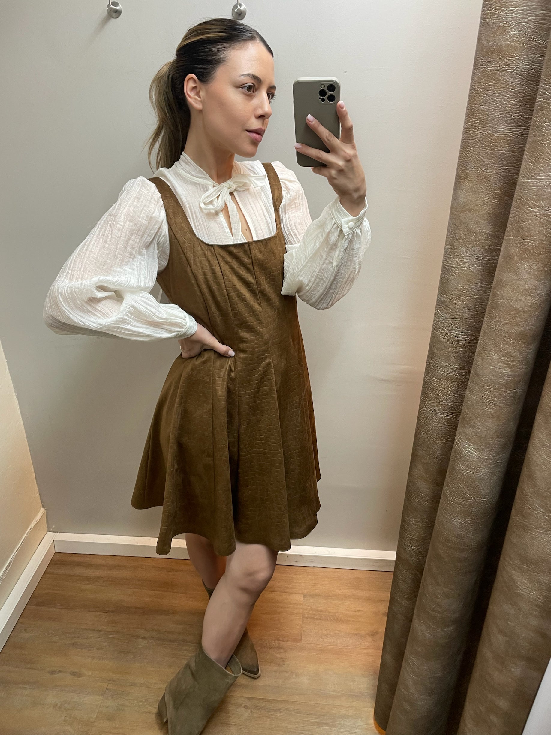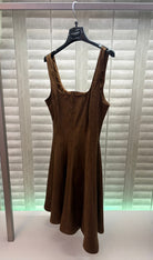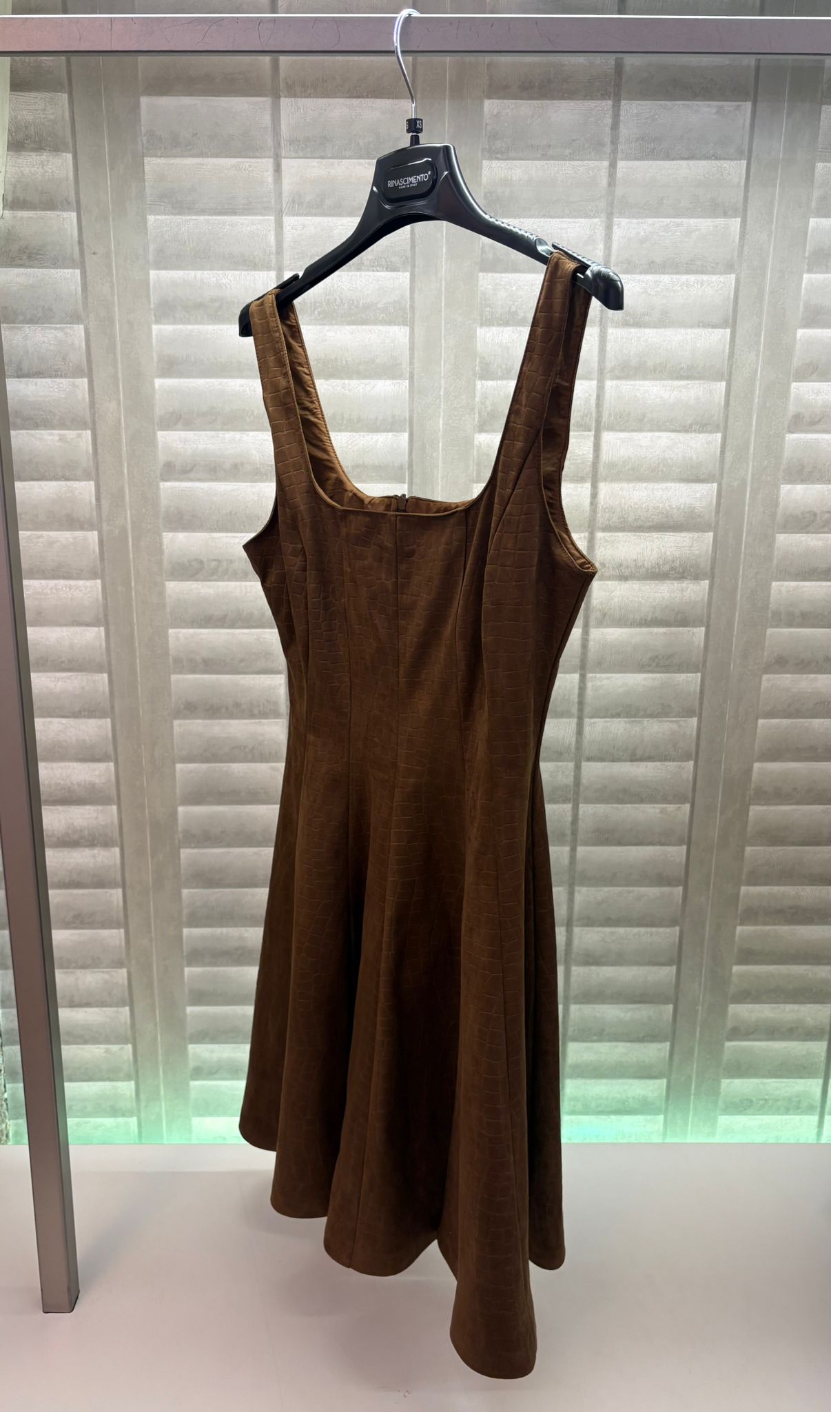 Elegantes braunes Trägerkleid mit feiner strukturierter Oberfläche und femininer ausgestellter Silhouette. Das weiche Material fällt fließend und sorgt für angenehmen Tragekomfort. Ideal zum Kombinieren mit Blusen oder Shirts für vielseitige Looks.