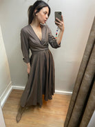 Dieses feminine Midi-Kleid überzeugt mit zeitloser Eleganz und einer besonders schmeichelhaften Silhouette. Der fließende Rock sorgt für eine wunderschöne Bewegung und unterstreicht den eleganten Look.Der feminine V-Ausschnitt und die 3/4-Ärmel verleihen dem Kleid eine klassische und gleichzeitig moderne Ausstrahlung.